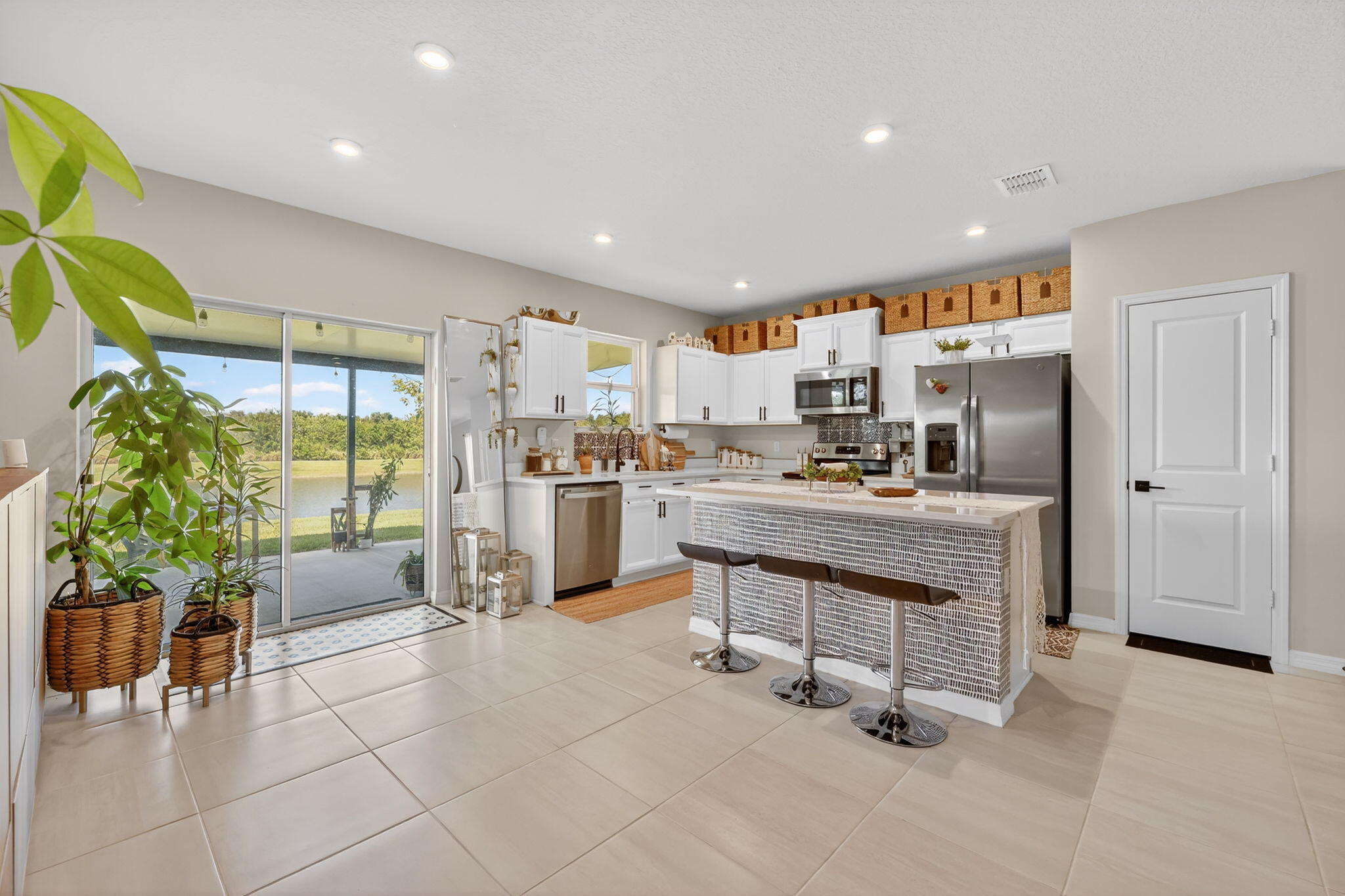 DescriptionThis charming 3 bedroom, 2 bath home with a 2 car garage attached parking, offers modern living in a convenient location. This spacious and bright open floor plan features tile flooring through out house. The kitchen includes a large island with an eat at bar, stainless steel appliances and a pantry. The open floor plan allows to interact from kitchen and living room. The backyard includes a covered patio with a lake view. This rental is available furnished and unfurnished and the furniture included is negotiable, personal decorations not included. Washer and dryer vacant as well upon request.